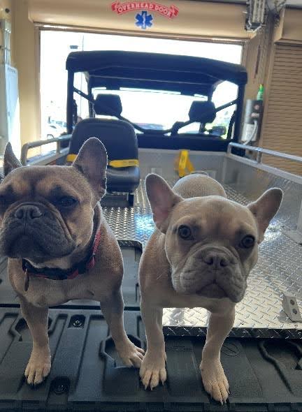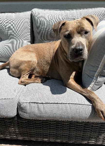 “Louie, an American Pit Bull Terrier, was born on November 24, 2018, Denver (left) was adopted from an AKC breeder, and she was born on April 7, 2022. Moose (right) was adopted from a family who was unable to care for him in March, and his birthday is October 27, 2023. They are both AKC pure bred French Bulldogs.
